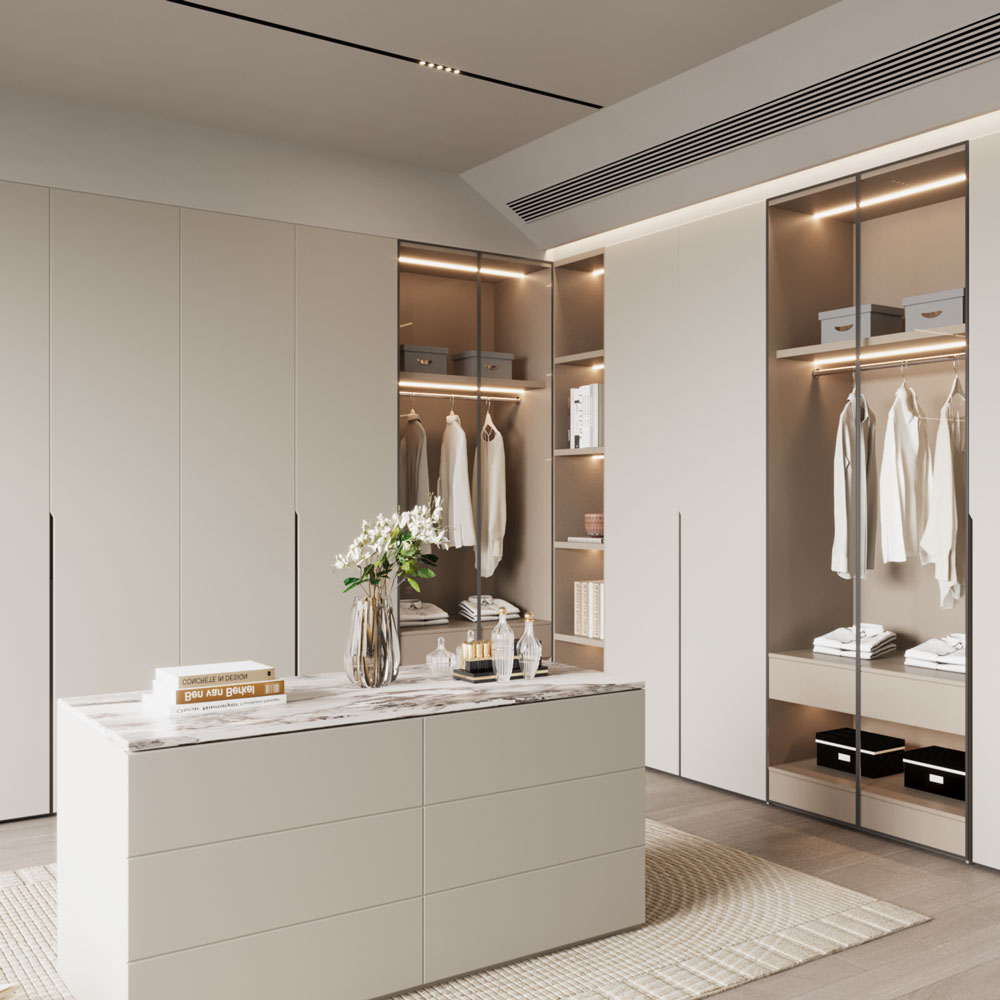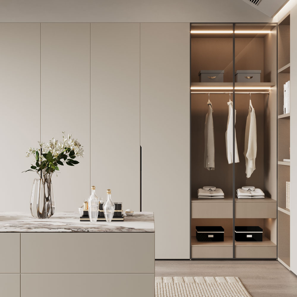 Sade ve şık tasarımım alana uyum sağlarken , konforu göz önünde bulundurduk. Kulpsuz model tercihimiz temiz bir yaşam alanı sağlıyor. Çözüm odaklı düşünme tarzımız sayesinde giyinme odası tasarımımızda depolama alanlarına özen gösterdik.